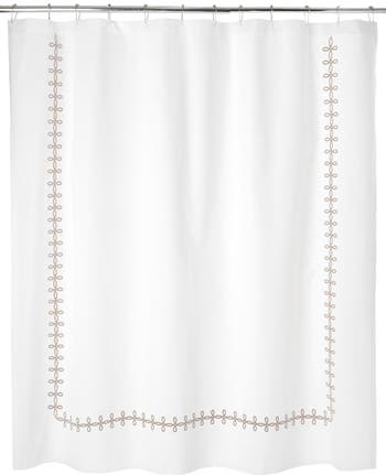 Bring Mediterranean ease to your bathroom with this cotton shower curtain featuring an embroidered inset border of a Grecian-inspired Gordian knot.