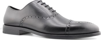 Traditional brouging traces the contours and makes a flourish on the toe of an oxford tooled from Italian leather and styled with a streamlined, formal profile.