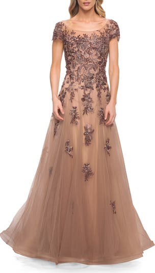 A-line tulle gown with short sleeves and gorgeous elaborate beaded design. Beaded applique cascade down the full skirt. Back zipper closure.