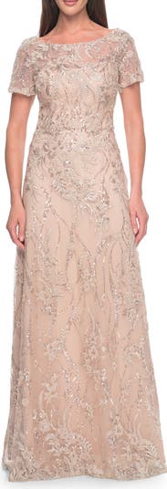 Long mother of the bride dress with gorgeous beaded fabric. The top features short sleeves and a high illusion neckline. Back zipper closure.