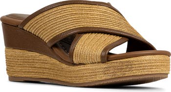 Braided raffia and smooth leather trim enhance the mixed-media sophistication of this platform wedge sandal complete with memory foam cushioning.
