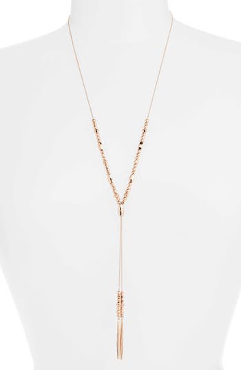 A slender bead slides up and down, cleverly adjusting the fit of this elegantly draped necklace strung with high-shine baubles.
