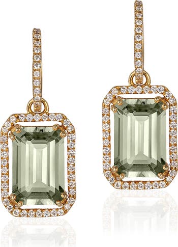 Bring a burst of color to your ensemble with these prong-set, emerald-cut stone drop earrings glowing with pavé diamonds and hand-polished 18-karat gold.