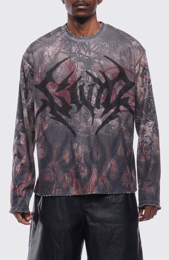 Woodsy camo, Gothic lettering and spray-painted logo details bring something for everyone to a T-shirt made of a soft waffle knit that lets air circulate when your activities heat up. Dropped shoulder seams emphasize the boxy, slouchy fit that says you've been partying in it forever.