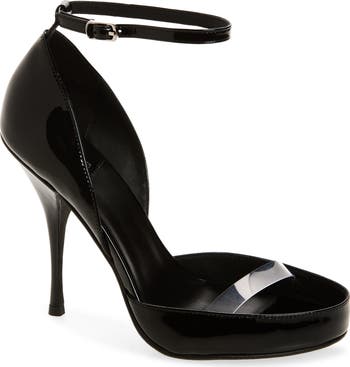 A translucent toe strap and elevated topline add futuristic elements to a glossy patent sandal featuring a tapered stiletto heel and adjustable buckle closure.