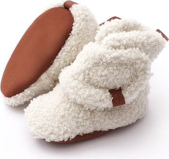 Never lose another sock. A super-soft faux shearling baby boot that is adjustable and stays on no matter what. Featuring our two-part adjustable closure system that remains secure on your baby's feet and grows with them. 6m+ has extra grip on soles for those first wobbly (and adorable) steps.