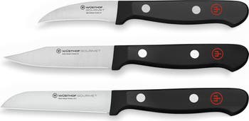This set includes one Peeling Knife, one 3-Inch Clip Point Paring Knife and one 3-Inch Flat Cut Paring Knife.