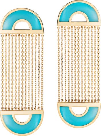 Polished chains run the gamut between two curved turquoise stones on these 18-karat-gold drop earrings that are sure to make you smile with every wear.