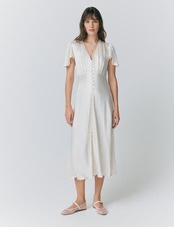 Timeless and elegant Grace dress, perfect for bridesmaids, with its delicate fabric-covered buttons and gentle V-neck design.