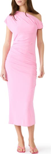 Rippled ruching and plenty of stretch enhance the shapely silhouette of this midi made in a shoulder-showing silhouette.