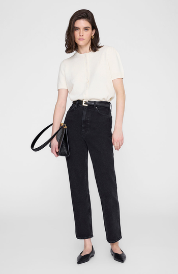 - Hand-tacked ANINE BING monogram charm at wearer's left hem