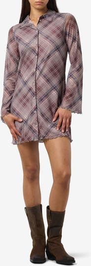 A lightweight lettuce-trimmed shirtdress is updated with a lively print and cut in a leggy length for work-to-play potential.