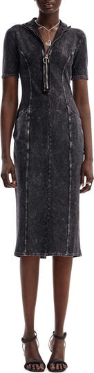 Glinting hardware adds a moto-inspired look to this midi dress crafted from gradient stretch denim.