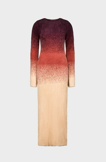 Fluffy gradient knit maxi dress with a side slit and long sleeves. This product is true to size, offering a comfortable and stylish fit for any occasion.