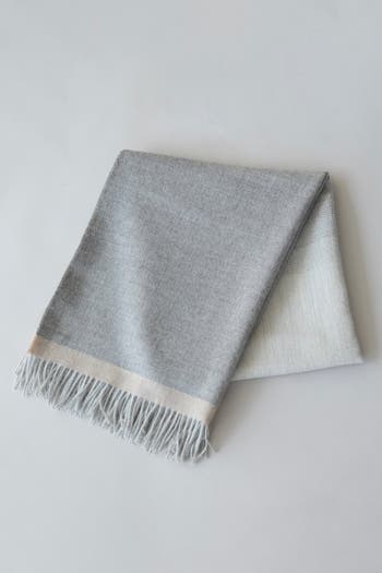 The Gradient Weave Throw is woven from 100% baby alpaca eco—fiber celebrated for its exceptional softness and naturally undyed color. Finished with a brushed hand feel, it offers luxurious warmth and tactile comfort. A subtle gradient transitions in tone across the surface, creating depth and visual texture through the natural hues of alpaca. Generously sized, it drapes beautifully over a bed, sofa, or can be worn as a cozy oversized scarf.