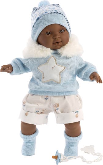 This beautifully detailed baby doll with a soft body is dressed in an adorable matching set with a pompom hat and knit booties. Grady cries three times and says "mama," but he is able to suck on his pacifier to soothe. This baby doll encourages children as they develop nurturing and self-help skills.
