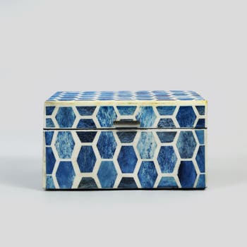 Bring timeless elegance to your space with the Gramercy Square Storage Box, featuring a hand-inlaid indigo and white bone pattern that blends traditional craftsmanship with modern charm. Perfectly sized at 6” x 6” x 4”, it’s ideal for organizing jewelry, keepsakes, keys, or small essentials while adding a refined touch to your vanity, entryway, or shelf.