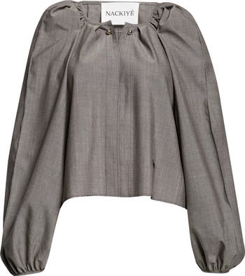 The sister-led design duo puts a new spin on traditional Mediterranean styles with this wool-rich top deconstructed with raw edges and a split neckline pierced with mirrored hardware.