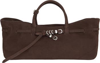 Belt-inspired buckle trim brings structure to this subtly slouchy shoulder bag crafted in smooth suede for a refined, modern feel.