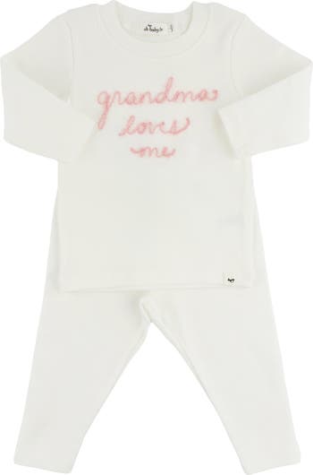 This charming two-piece outfit from oh baby! shines with grandma’s love. It includes a soft cream long-sleeve tee embroidered with an embroidered pink "grandma loves me" phrase, matched with stretchy elastic waist pants for ultimate comfort. Available in infant sizes. Designed in Minnesota.