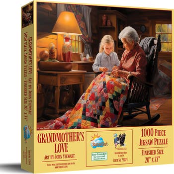 Delve into the heart-warming realm of nostalgia and family bonding with the Grandmother's Love 1000 pc Jigsaw Puzzle by John Stewart, a beautiful SunsOut Puzzle that captures the love spanning across generations. Crafted from eco-friendly recycled cardboard, the puzzle pieces interlock securely, creating an effortless assembly experience. The jigsaw puzzle, produced in the USA, features licensed artwork from renowned artist John Stewart and highlights SunsOut's commitment to high manufacturing standards, delivering exceptional quality and craftsmanship. The completed puzzle measures an impressive 20" x 27", offering an elegant display for any room. As a sustainable choice, SunsOut Puzzle uses soy-based inks and recycled boards specially made to endure, supporting a greener planet. Despite the unlikely event of missing or damaged pieces, SunsOut offers a worry-free guarantee with their dedicated customer service, there to ensure your satisfaction. The Grandmother's Love puzzle embodies the spirit of Americana, stirring feelings of warmth, familial love, and comfort. It's not just a fun challenge, but a journey into cherished memories and shared stories, making it an ideal choice for adults seeking a nostalgic puzzle experience. Enjoy the timeless beauty and emotional depth of the Grandmother's Love Jigsaw Puzzle, a beautiful convergence of artistry and heartfelt moments that you can treasure for years to come.