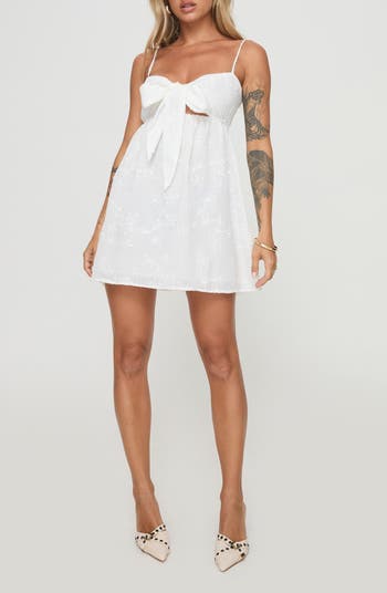 Sweeten the occasion in this embroidered mini designed with a charming front bow and an eye-catching back cutout.