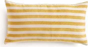 The indoor pillow that lives beautifully outdoors. Enjoy the upscale luxury and durability of Jacquard. With a graphic goldenrod and cream striped pattern, it adds a pop of cheerful color to the sofa. This pillow is weather resistant and responsibly made. Filled with 100% recycled fibers.