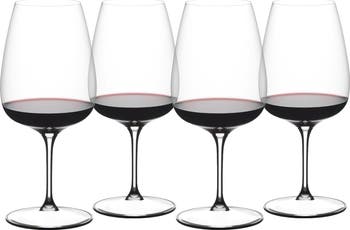 The Grape@Riedel Cabernet/Merlot Wine Glass Set includes four 29.25-ounce glasses designed to enhance full-bodied red wines such as Cabernet Sauvignon and Merlot. The large bowl promotes proper aeration, helping soften tannins and release complex aromas while directing wine to the ideal areas of the palate for improved balance and flavor. Crafted from clear, high-quality glass, these elegant yet durable wine glasses are perfect for both everyday use and entertaining, offering exceptional value with the Buy 3 Get 4 set.