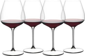 The Grape@Riedel Pinot Noir/Nebbiolo Wine Glass Set includes four 26.5-ounce glasses designed to enhance light to medium-bodied red wines such as Pinot Noir and Nebbiolo. The wide bowl allows proper aeration while the tapered rim concentrates delicate aromas and directs wine to the ideal areas of the palate for improved balance and flavor expression. Crafted from high-quality clear glass, these elegant yet durable wine glasses are perfect for everyday use and entertaining, offering excellent value with the Buy 3 Get 4 set.