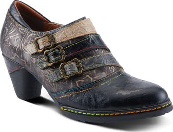 Buckled vamp straps and colorful stitching add modern elements to a leather ankle bootie lifted by a stacked block heel.