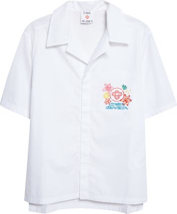 Slip into a retro-eclectic rhythm with this crisp cotton-poplin camp shirt, where classic Casablanca icons and the season's orchid motif dance through the kaleidoscopic color wheel of Chicago rave culture—Charaf Tajer's muse for spring '26.