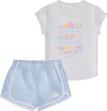 Neon-accented flowers grow atop this supercute short-sleeve top paired with sporty shorts.