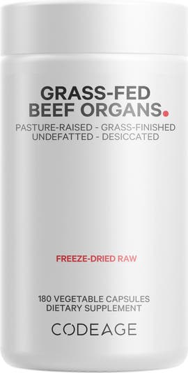Codeage Grass Fed Beef Organs supplement combines beef liver, heart, kidney, pancreas and spleen sourced from grass-fed, grass-finished, and pasture-raised beef. This supplement is freeze-dried, non-defatted, and desiccated, aiming to preserve the nutrients found in different meat organs.