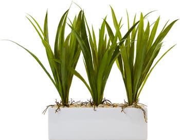 Crisp, symmetrical blades of glass tower over a clean, white planter for a modern floral arrangement. With textured roots and sand toned rock filling, this arrangement makes the perfect coffee table topper or entryway accent. Artificial grass and planter stands at 16" tall.
