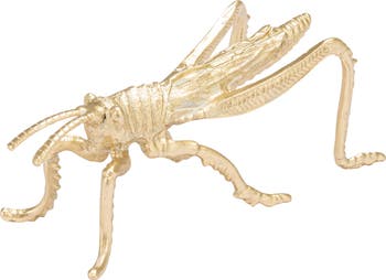- A sculptural grasshopper figurine cast in metallic pewter with a lustrous gold finish and lifelike form