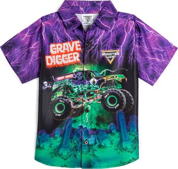 Get ready to rev up family fun with this officially licensed Monster Jam Grave Digger Hawaiian button-down shirt! Featuring bold, colorful graphics and a collared design, this shirt blends vacation vibes with monster truck excitement. Soft and lightweight with an easy button-front fit, it's available in sizes for kids and adults—perfect for matching moments at parties, summer outings, or family photos that go full throttle.