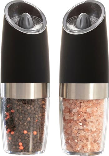 Gravity electric salt and pepper grinder set with automatic one‑handed operation, adjustable ceramic mechanism, LED light, and sleek modern design.