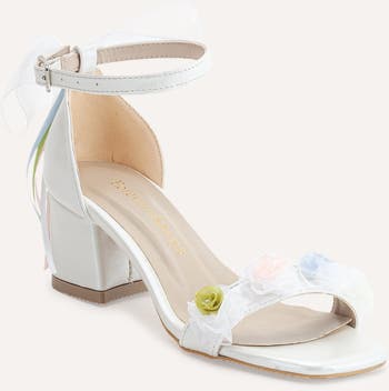 A playful block-heel sandal decorated with multicolor floral appliqués and finished with a romantic organza bow at the ankle. Perfect for bridal looks or special occasions.