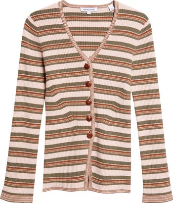 A fresh take on a forever staple, this slim-fit cardigan is knit in ribbed stripes for a sleek, elongating effect. A V-neckline, button-front closure and chic cutaway hem define the silhouette, while long sleeves with flared cuffs add a touch of flare.