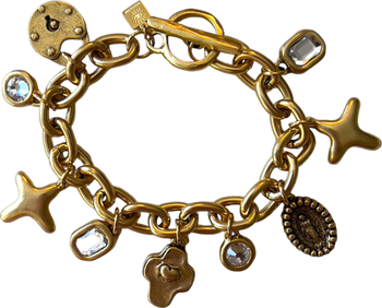 It's giving EXTRA. A glitzy, glammy charm bracelet! 7.5” chunky 12k antiqued gold plated stainless steel chain bracelet with an assortment of handcrafted 12k antiqued gold plated pewter and rhinestone charms. It has a mini 12k antiqued gold plated pewter toggle clasp for easy on and off, no help needed ;)
