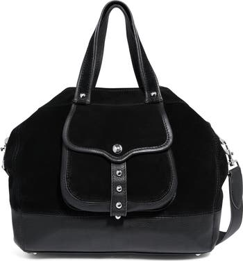 Polished hardware and smooth leather trims highlight the voluminous profile and supple suede exterior of a pocket-packet shopper bag outfitted with an optional shoulder strap for hands-free wear.