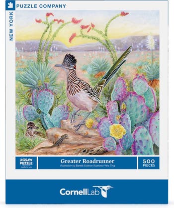 Explore the vibrant beauty of the desert with the Greater Roadrunner 500 piece puzzle from the Cornell Lab of Ornithology collection. Illustrated by Bartells Science Illustrator Vera Ting, this captivating artwork features a mother roadrunner perched gracefully among desert grasses, while her curious baby peeks out from the tall blades. The scene is enriched with blooming cacti and a variety of colorful desert flowers, showcasing the unique flora and fauna of the arid landscape.\r\n\r\nCrafted with random die-cut pieces—ensuring no two are alike—this puzzle offers a rewarding and one-of-a-kind experience for puzzlers and bird enthusiasts alike. Proudly made in the USA, the Greater Roadrunner puzzle combines exceptional quality with an appreciation for wildlife and natural beauty.\r\n\r\nPerfect for birdwatchers, desert lovers, and fans of fine illustration, this puzzle invites you to immerse yourself in the charm and wonder of the American Southwest. Piece by piece, bring this heartwarming desert scene to life and celebrate the artistry of nature.