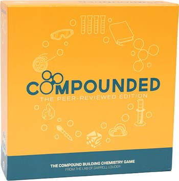 COMPOUNDED: THE PEER-REVIEWED EDITION - Compounded is a game about building chemical compounds through careful management of elements, a fair bit of social play and trading, and just a bit of luck. In Compounded, players take on the roles of lab managers, hastily competing to complete the most compounds before they are completed by others – or destroyed in an explosion. Some compounds are flammable and will grow more and more volatile over time; take too long to gather the necessary elements for those compounds and a lot of hard work will soon be scattered across the lab. Although Compounded does involve a fair share of press-your-luck tension and certainly some strategic planning, the most successful scientists will often be those who strike a good trade with their fellow lab mates. Players are able to freely trade elements, laboratory tools, and even favors – if there is truly honor among chemists! The new Compounded: The Peer-Reviewed Edition offers not only an upgrade in components, but a complete reworking of the rules to offer better gameplay. Faster, easier, and able to eke out a win with just the right strategic scoring as the final count is tallied, Compounded: The Peer-Reviewed Edition offers an all new way to have fun in the lab!