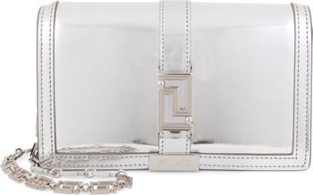 Silver Greca hardware shines on the flap and chain strap of a compact wallet crafted from metallic leather.