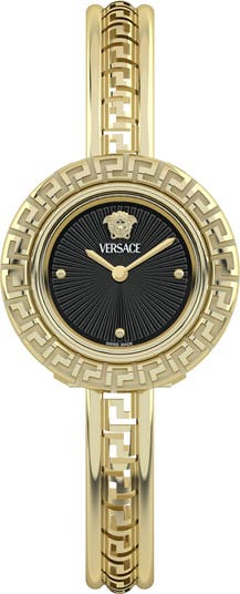 Signature Greek key motifs define the bezel and strap of this elegant Swiss-made bracelet watch featuring a round guilloche dial with precise two-hand movement.