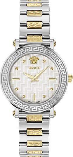 A signature Medusa head and Greek-key detailing add rich heritage beauty to this Swiss-quartz timepiece boasting a guilloche dial and two-tone bracelet.