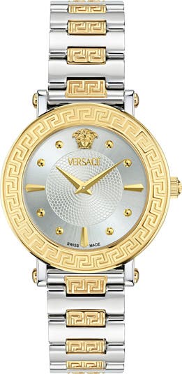 A signature Medusa head and Greek-key detailing add rich heritage beauty to this Swiss-quartz timepiece boasting a guilloche dial and two-tone bracelet.