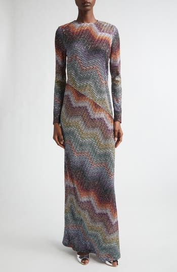 Caperdoni looms create the signature Greek-style zigzag patterning on this long-sleeve, full-length dress—a simplified style that lets the lamé and sequins elegantly illuminate the mesmerizing design.