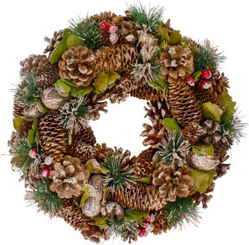 Make a one-of-a-kind display in your home this season with this decorated wreath. The wreath features pinecones, rustic bells, and berries all covered with white frosting. You can add the wreath to a door, wall, or even used as a centerpiece with a candle. Product Features: Artificial Christmas wreath The wreath is green, brown, and white Features pinecones, rusted bells, and berries This wreath is frosted in with white snow Round in shape Unlit For indoor use only No assembly required – wreath comes in 1 piece Dimensions: 13" diameter Material(s): plastic/woodNote: Branches are compressed for shipment, and need to be fluffed out upon arrival to look like the photo.