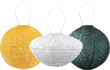 Green Bay Soji Stella Bundle includes: 1 x Soji Stella Monstera Marigold 1x Soji Stella Market Ink 1 x Soji Stella Crown Chantilly Lace The lightweight weather-resistant DuPont Tyvek material is the hallmark of the Stella line and these lanterns are tough enough to show off their lacy beauty outdoors all year round. These solar lanterns charge during the day and automatically turn on at dusk each night. Soji Solar Lanterns are equipped with one AAA rechargeable battery, solar panel, bright LED light and stainless steel hardware. Designed for outdoor use.